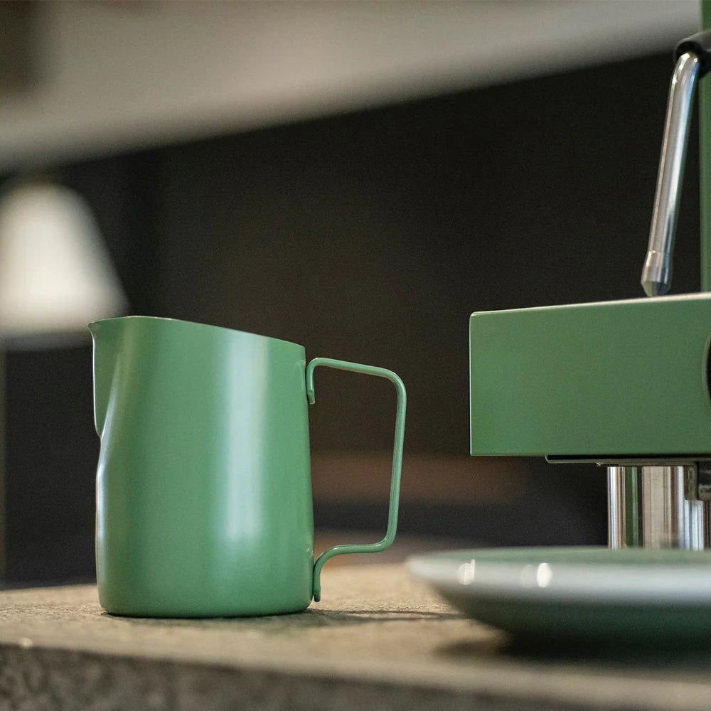Developed in collaboration with Slow Pour Supply, this milk pitcher features an extra round spout. It's perfect for wave patterns that demand dramatic, bold lines.